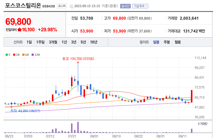 증권 > News봇 뉴스: 오후 2시 54분 현재 포스코스틸리온(058430)이 +29.98% 오른 69,800원(▲16,100)으로 장중 상한가에 진입했다. 거래대금은 1,284...